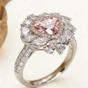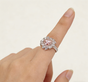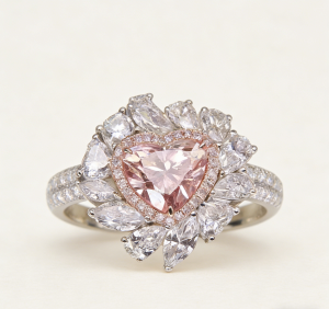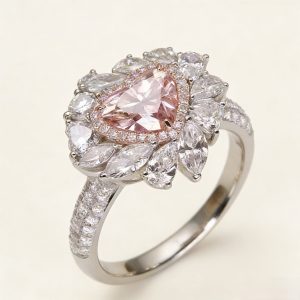 The main stone is a heart-shaped cut pink diamond. The soft pink tones and brilliant fire interweave, conveying a gentle yet resolute emotional power. The outer part of the main stone adopts a double-layer inlaid design, and the inner circle selects small pink diamonds that correspond to the color tone of the main stone, creating a harmonious transition of color gradation. The outer circle is set with colorless diamonds, which set off the softness of the pink main stone with their pure light. This two-color diamond setting design not only enriches the visual layers but also makes the main stone stand out more through the contrast of warm and cool tones