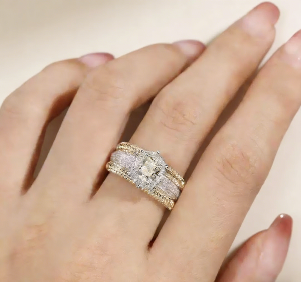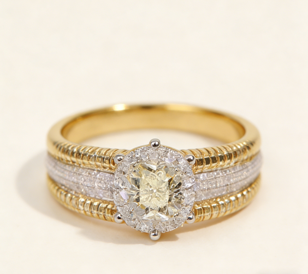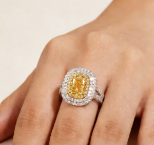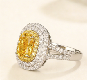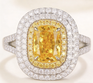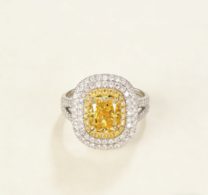 The double-layer inlay design surrounding the main stone sets off the yellow diamond more brilliantly like stars arching around the moon. The closely set white diamonds in the outer ring form a sharp contrast with the warm yellow tone of the main stone, which not only highlights the intense color of the yellow diamond but also fills the overall design with a sense of layering through the flow of metallic luster.
