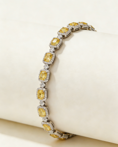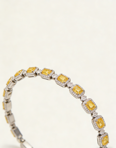 The main body is composed of multiple groups of “yellow diamond arrays” connected in series. Each cushion-cut yellow diamond is surrounded by circles of white diamonds that are intricately set like star rings. The warm glow of the yellow diamonds and the cold fire of the white diamonds form a wonderful balance. Every time the light flows, it refracts a rich and dazzling light with multiple layers