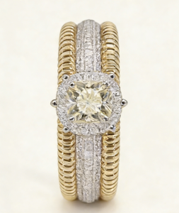 In the center of the main diamond ring, there is an oval-cut main diamond, like frozen sunlight, radiating a warm and resolute glow. It is gently surrounded by a circle of closely set diamonds. These small diamonds are like star rings, making the main diamond even more dazzling and eye-catching. The ring setting is made of classic gold material, with exquisite textures on both sides. It not only adds a retro charm but also endows the ring with a unique texture and layers